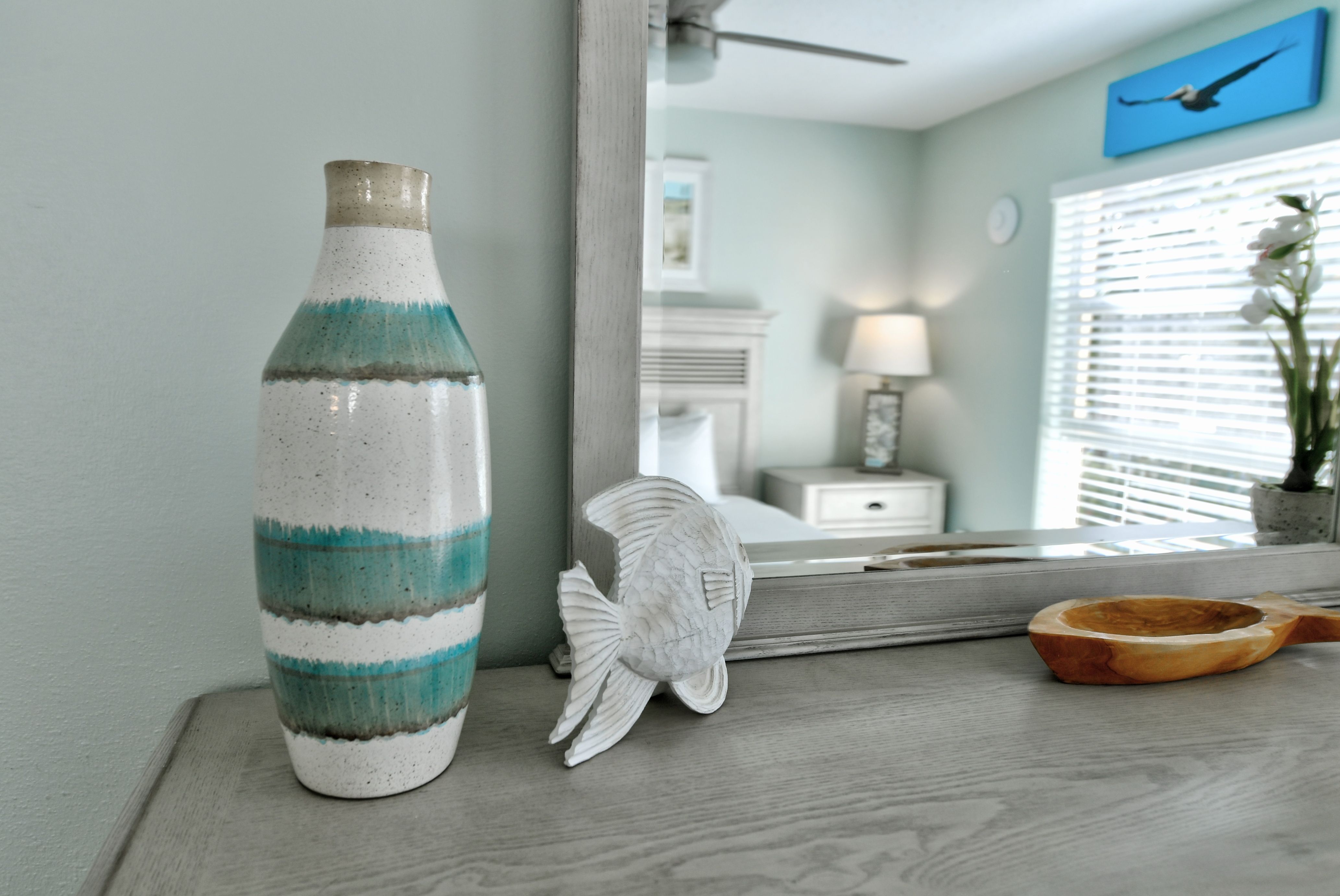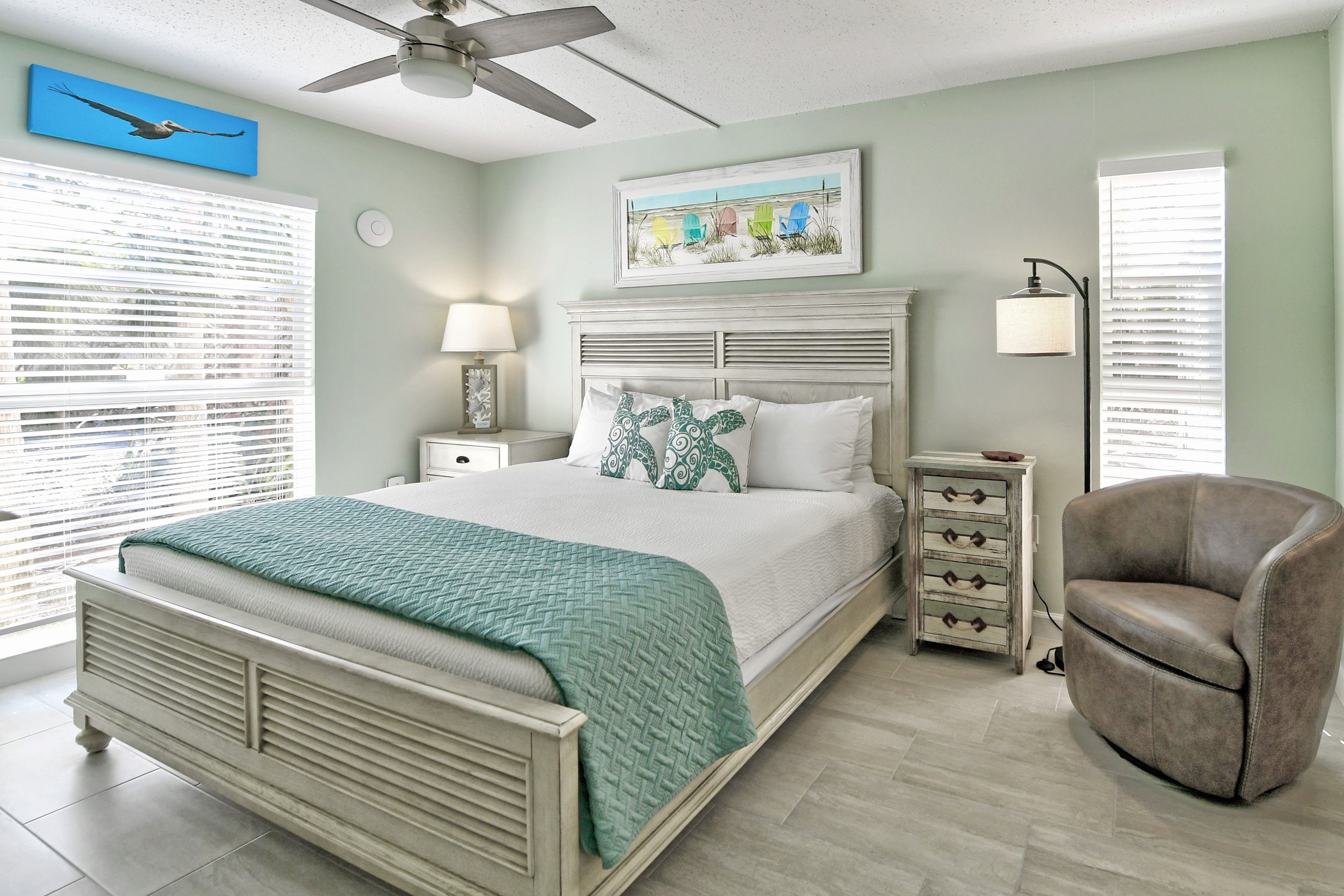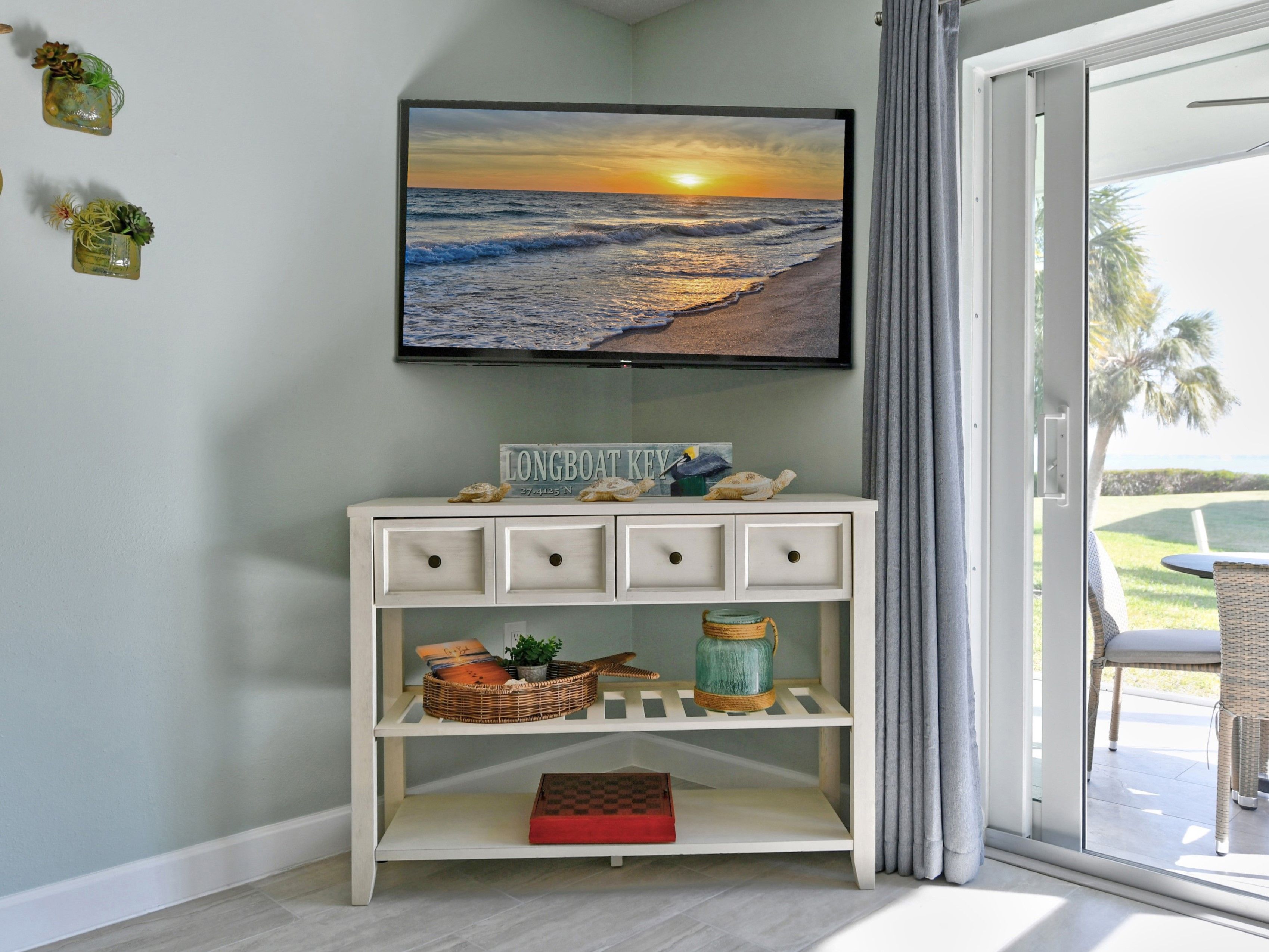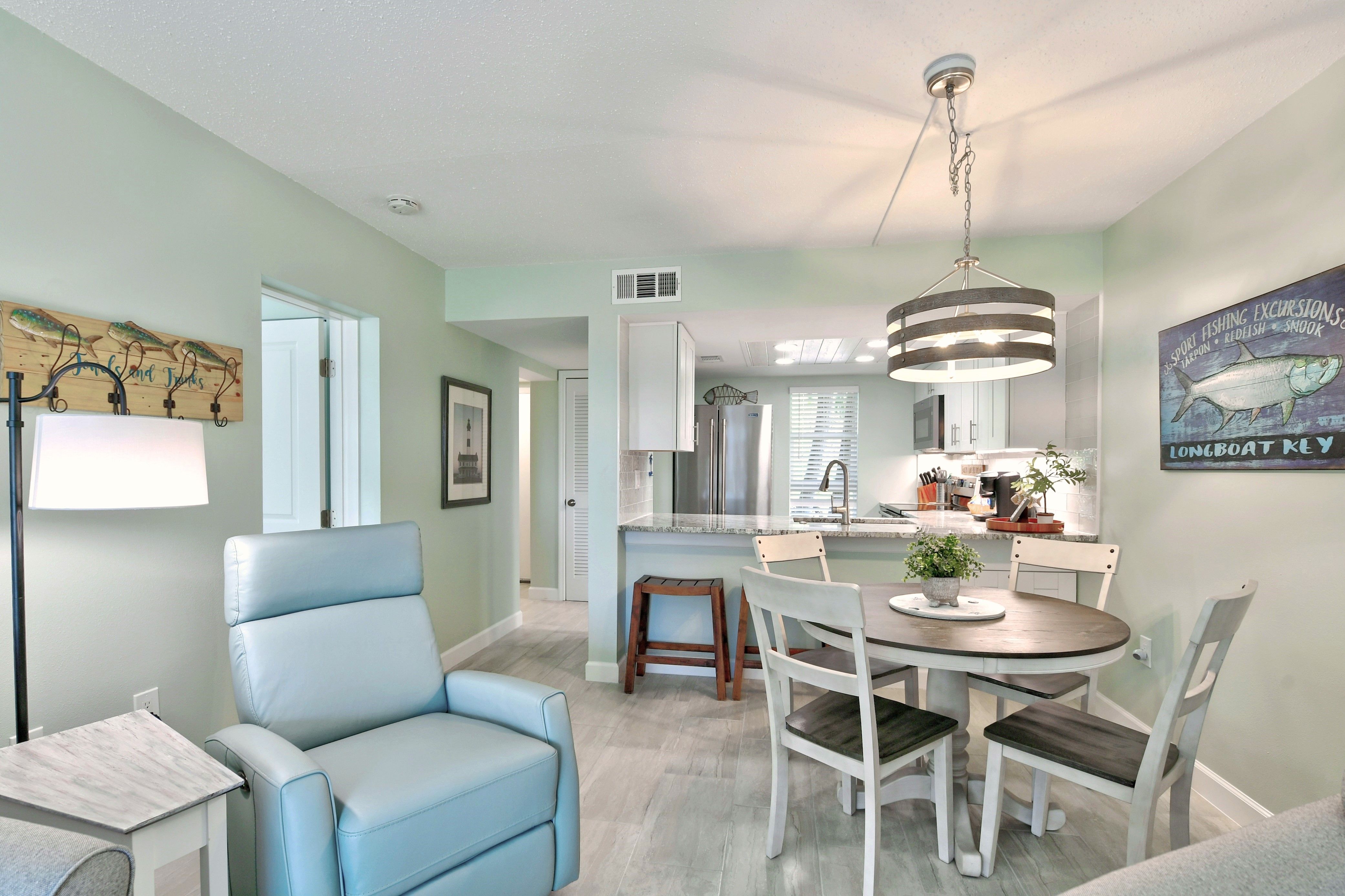Relax in this privately owned and “coastal themed” ground floor condo that sleeps 4 with bay views from the privacy of your screened lanai, the living room and bedroom! The one-bedroom, one-bathroom condo includes a full-size kitchen with granite counters, fully equipped kitchen w/ice maker, both Keurig and drip coffee makers, cookware, dishes and utensils, a Serta Sleeptrue king mattress, an upgraded memory foam queen mattress on sleeper sofa, new lighting and furnishings. For entertainment - games and books are also provided, as well as smart TVs with ROKU and cable, complimentary WIFI – never compromising the comforts of home. Complimentary laundry facilities, beach chairs/umbrellas, linens/beach towels, cooler for the beach, parking and a fabulous pool and hot tub are all included.