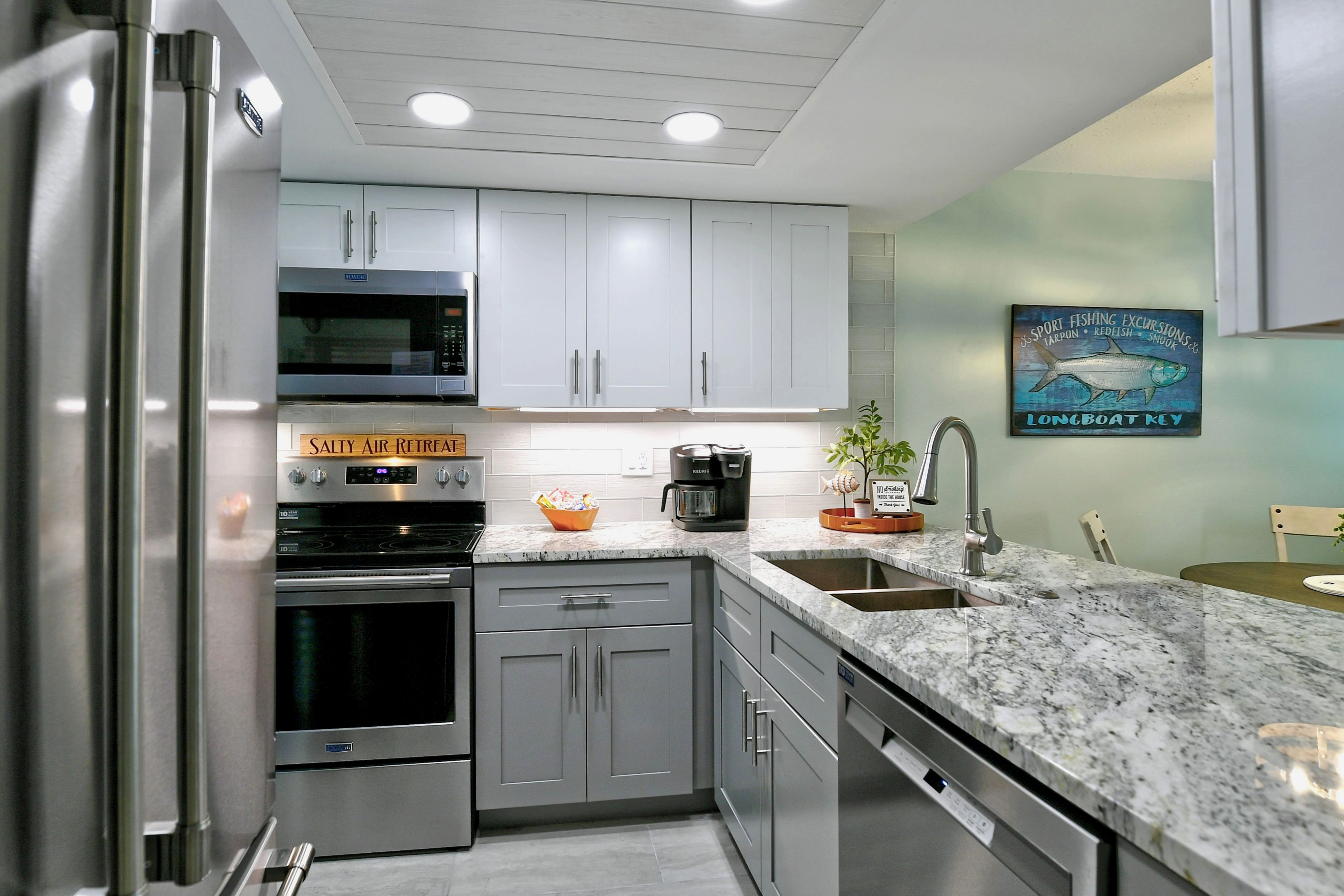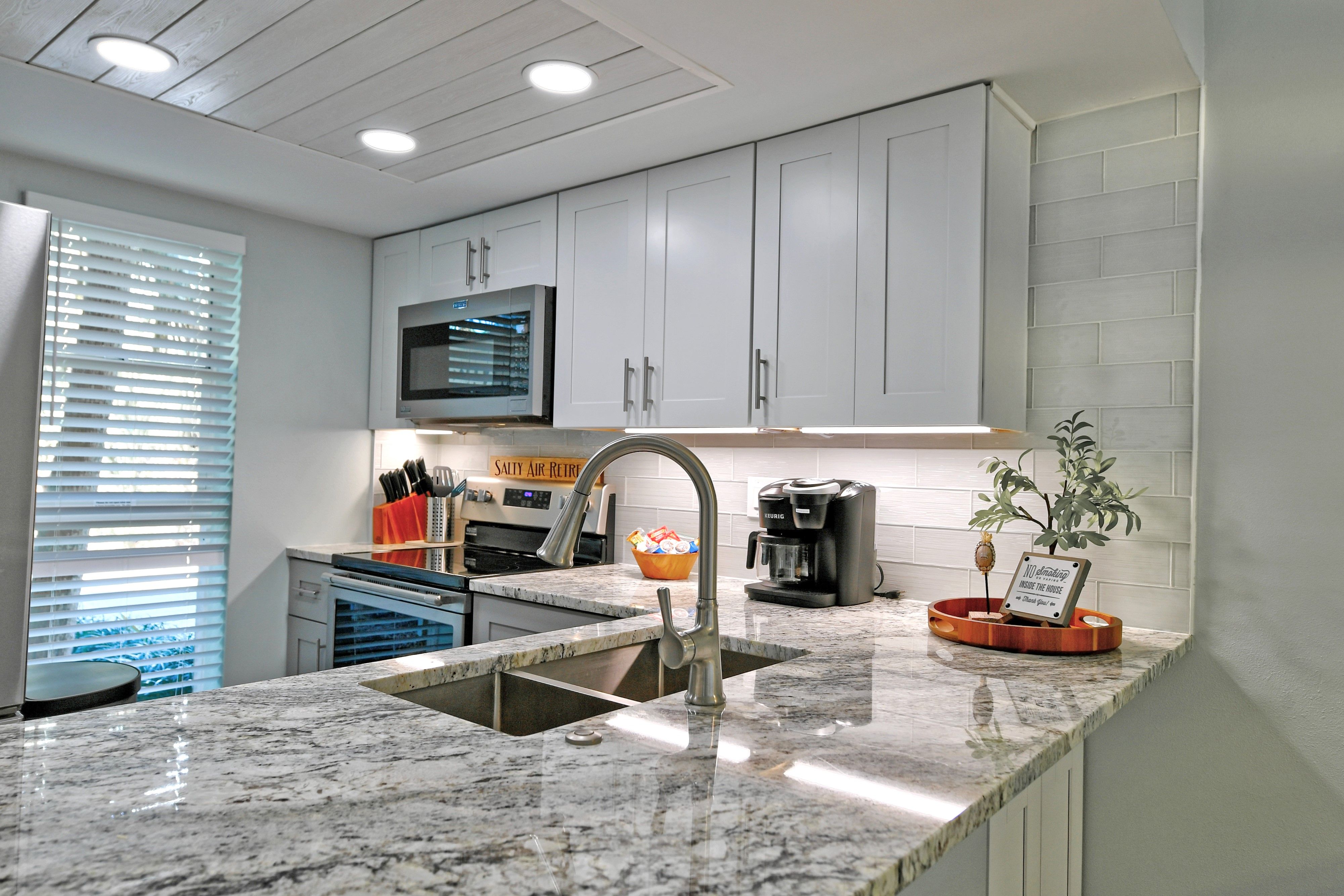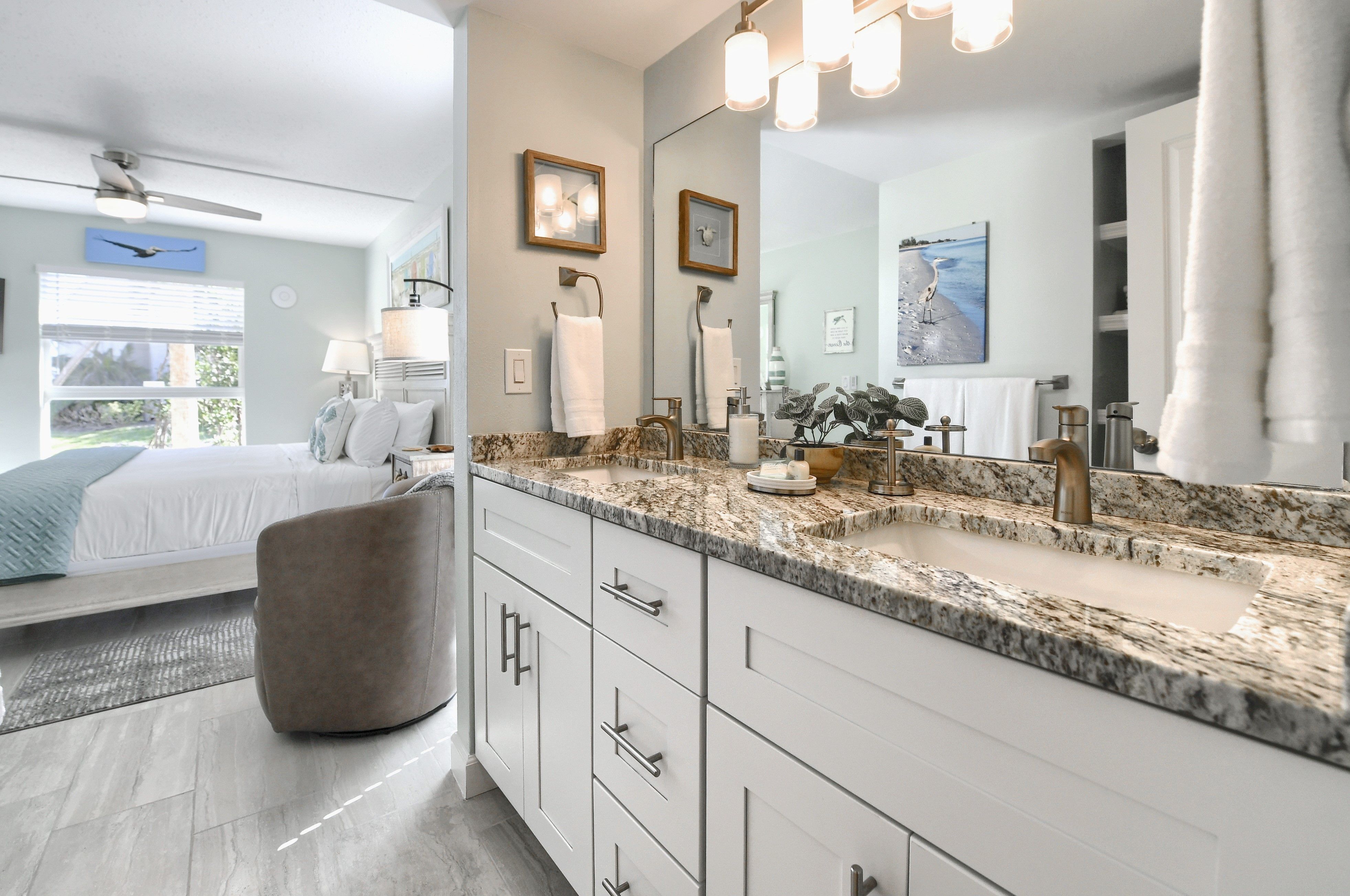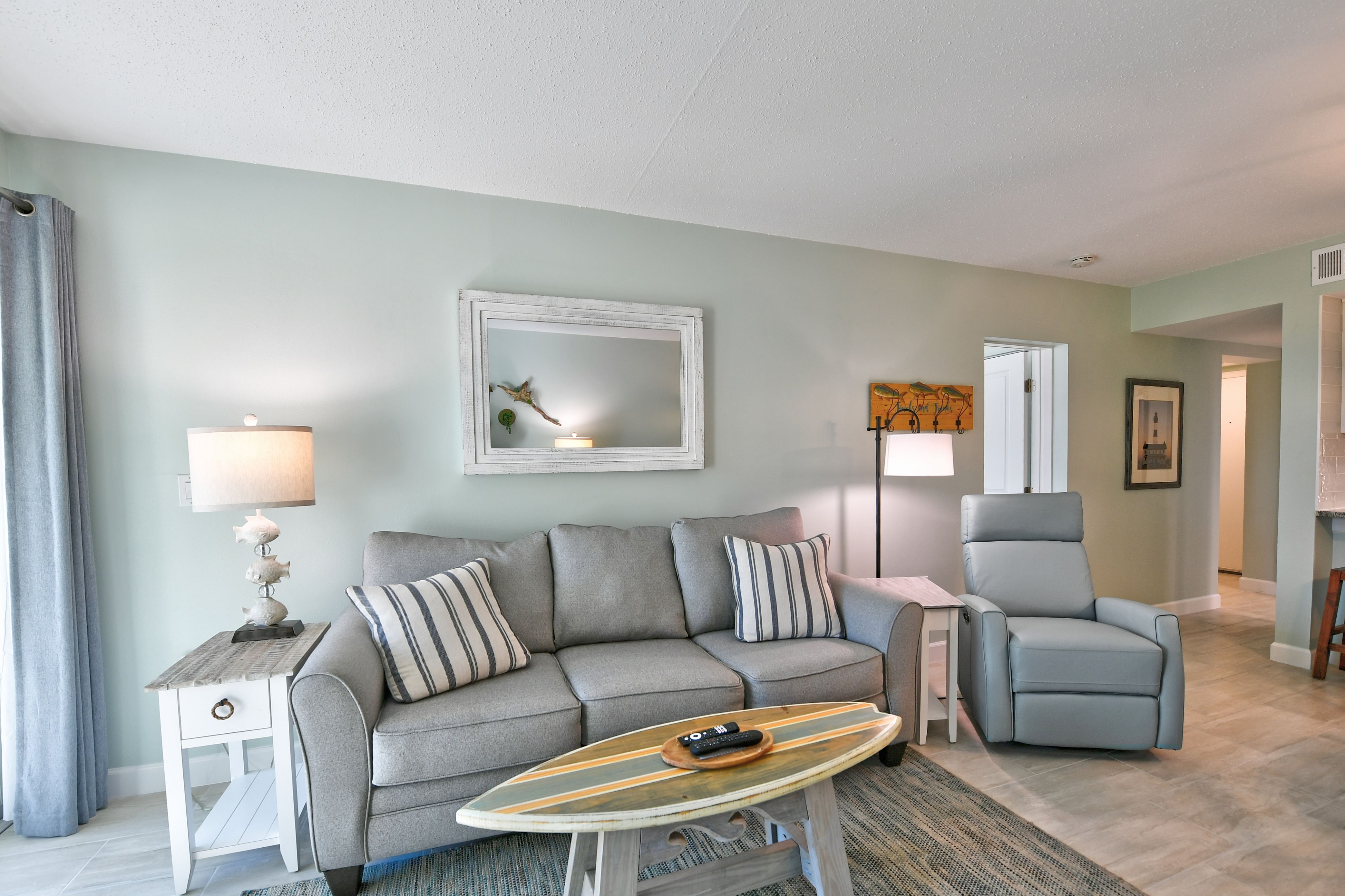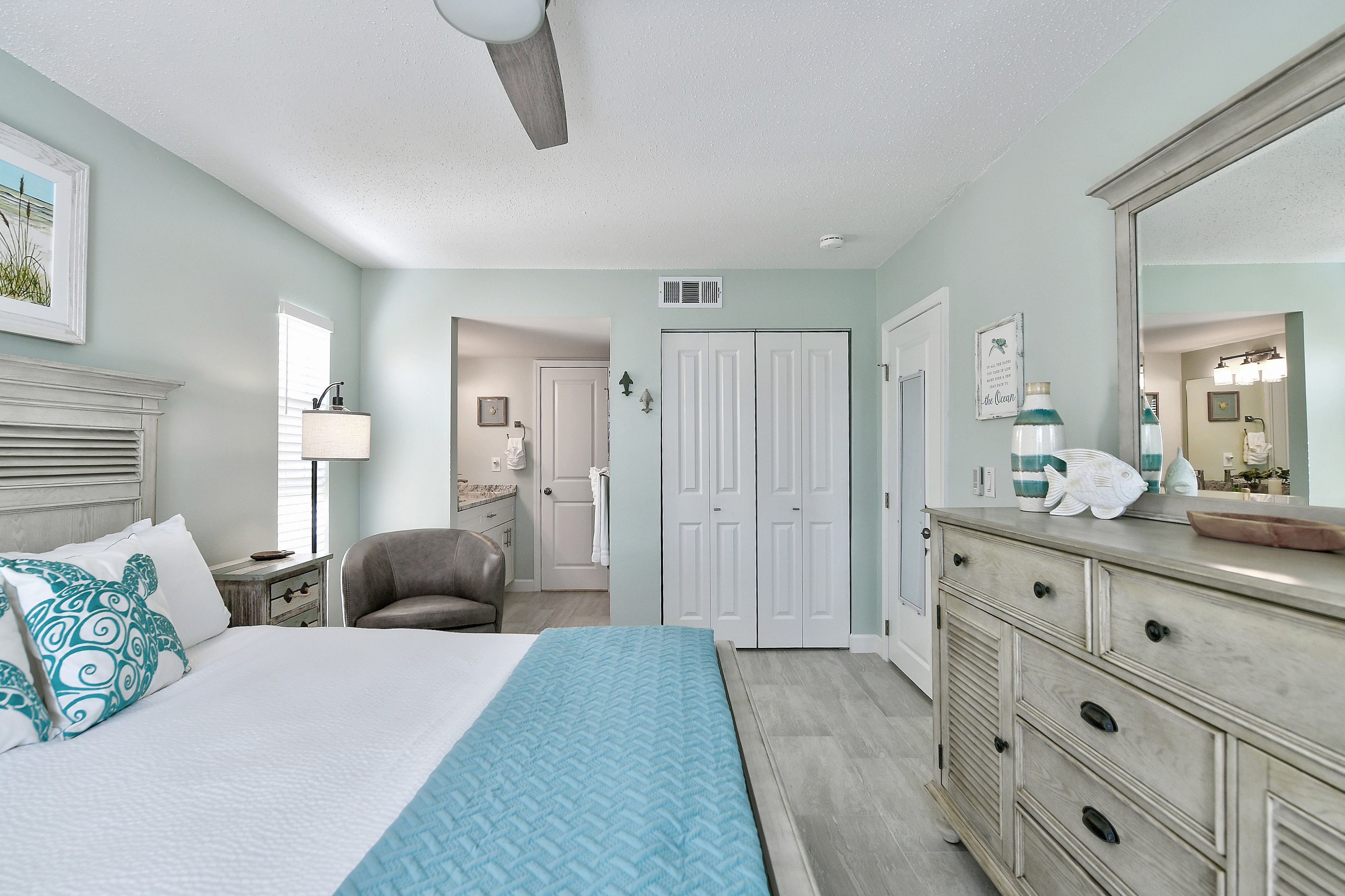 Relax in this privately owned and “coastal themed” ground floor condo that sleeps 4 with bay views from the privacy of your screened lanai, the living room and bedroom! The one-bedroom, one-bathroom condo includes a full-size kitchen with granite counters, fully equipped kitchen w/ice maker, both Keurig and drip coffee makers, cookware, dishes and utensils, a Serta Sleeptrue king mattress, an upgraded memory foam queen mattress on sleeper sofa, new lighting and furnishings. For entertainment - games and books are also provided, as well as smart TVs with ROKU and cable, complimentary WIFI – never compromising the comforts of home. Complimentary laundry facilities, beach chairs/umbrellas, linens/beach towels, cooler for the beach, parking and a fabulous pool and hot tub are all included.