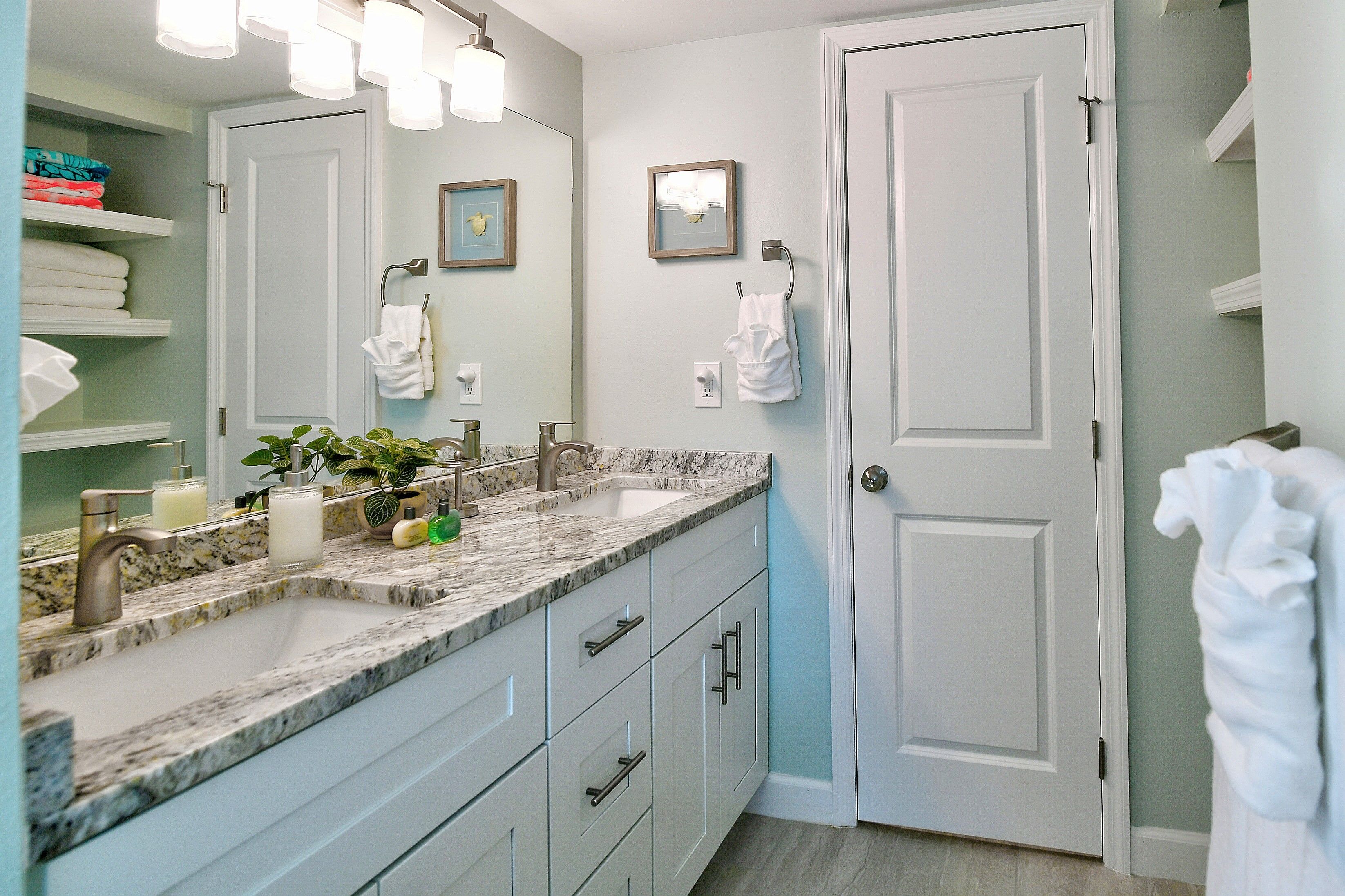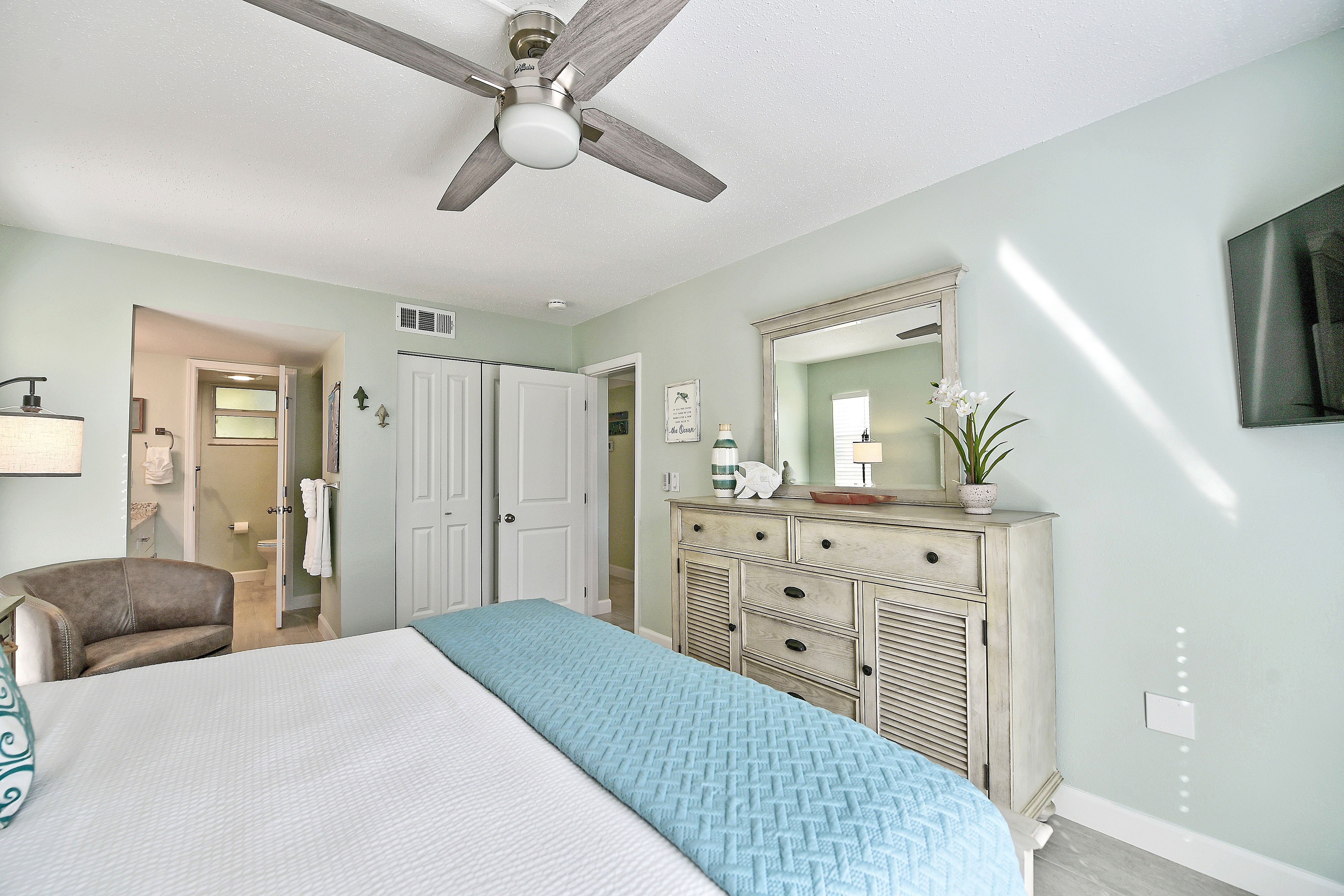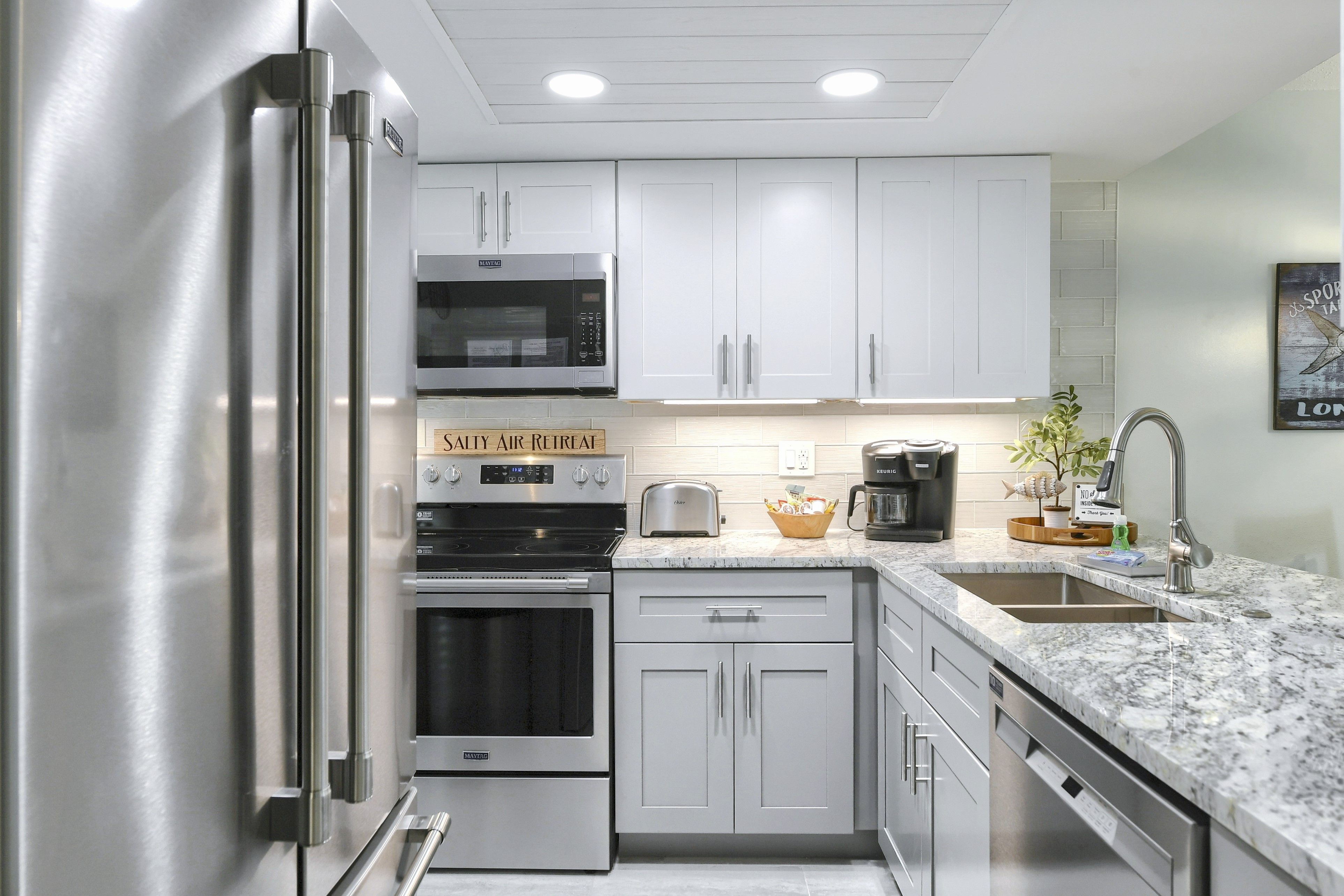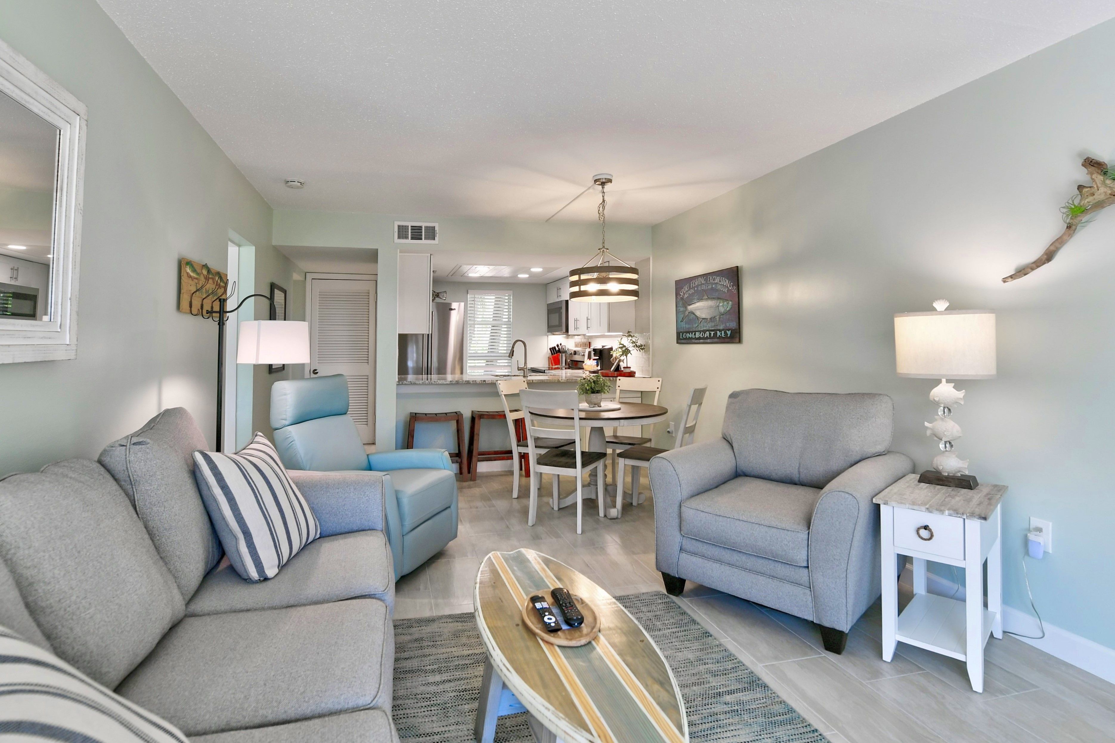 Relax in this privately owned and “coastal themed” ground floor condo that sleeps 4 with bay views from the privacy of your screened lanai, the living room and bedroom! The one-bedroom, one-bathroom condo includes a full-size kitchen with granite counters, fully equipped kitchen w/ice maker, both Keurig and drip coffee makers, cookware, dishes and utensils, a Serta Sleeptrue king mattress, an upgraded memory foam queen mattress on sleeper sofa, new lighting and furnishings. For entertainment - games and books are also provided, as well as smart TVs with ROKU and cable, complimentary WIFI – never compromising the comforts of home. Complimentary laundry facilities, beach chairs/umbrellas, linens/beach towels, cooler for the beach, parking and a fabulous pool and hot tub are all included.