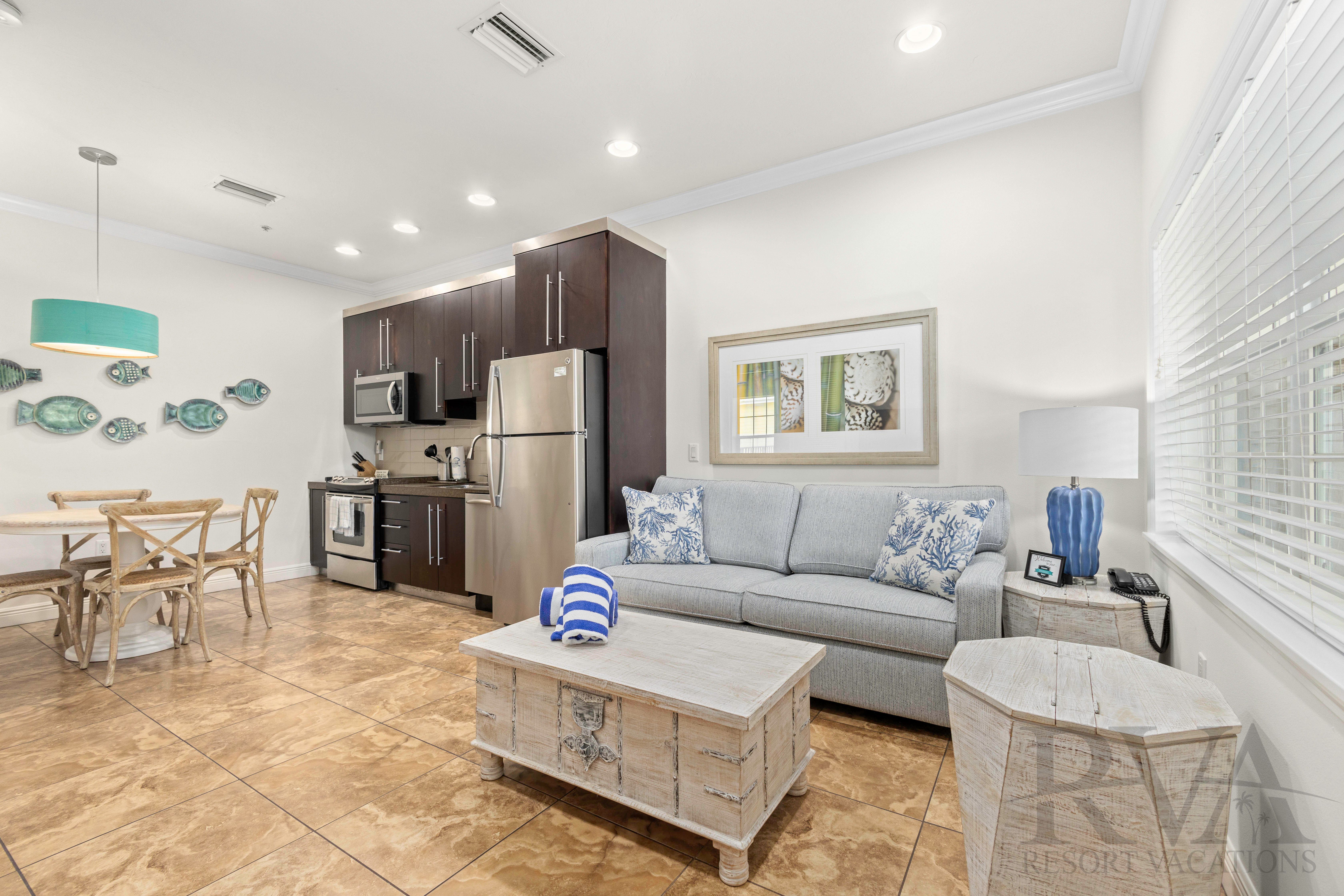 RVA offers beautiful turquoise waters and quartz-crystal white sands, which have been officially ranked as the “finest, whitest sand beach in the world.” This new resort features modern decor, mixed with the youthful attitude of this world-famous destination, making this chic resort one of the most desired accommodations on Siesta Key. Decorated using clean lines and bright colors, all while remaining inviting and engaging, this resort includes all that is signature to Southwest Florida. Each unit features a full-size kitchen, large flat-screen TV, modern decor, Avonite countertops, and top-of-the-line Four Seasons. Your vacation in Southwest Florida doesn’t stop there; Siesta Key is the perfect spot for a young family or the young-at-heart. This barrier island is energized – with plenty of Frisbee throwing, volleyball, jogging, beachside tennis, biking and picnicking. The Siesta Village offers a spirited combination of different sides of Sarasota, from candlelit dining to beach boutiques and cool daiquiris. Best of all, you can laze away the afternoon and partake in a “siesta” in the sun, either swaying on your favorite raft above the gentle waves or on the beach near the lapping shoreline. For luxurious accommodations on Siesta Key, the only choice is The Beach Club. Accommodations: The Beach Club at Siesta Key offers studio, one- or two-bedroom units, just steps from the beautiful beaches. Relax by the heated community pool or stroll through nearby Siesta Key Village, where cuisine and entertainment take on an island flair. Unit #100B Features: 1-bedroom, 1-bathroom unit in building B with a private patio. Bedding: 1 King, Sleeper Sofa Beach Access: The Beach Club at Siesta Key offers convenient beach access to the world-famous Siesta Key sand just across the street from our property. Access is steps away thru a shared community gate; the code to the gate is provided upon arrival. We offer complimentary beach chairs and umbrellas (available outside the office on a first-come, first-served basis). For those looking to experience more - the Siesta Key public beach is a short 2 mile drive from the resort and includes a snack bar, tennis courts, a playground, picnic and grilling areas, a weekly drum circle and more. Resort Features: Beach Access Footsteps Away, Heated Swimming Pool, Hot Tub, On-site Office, Private or Community Patios, Complimentary Wireless Internet Access, Full-size Kitchens, Avonite Countertops, Stainless Steel Appliances, LCD Flat-Screen TV's, Private Washer/Dryer, Ideal Siesta Key Location Housekeeping Note: This resort is a self-service environment, however daily maid service is available upon request for an additional fee.