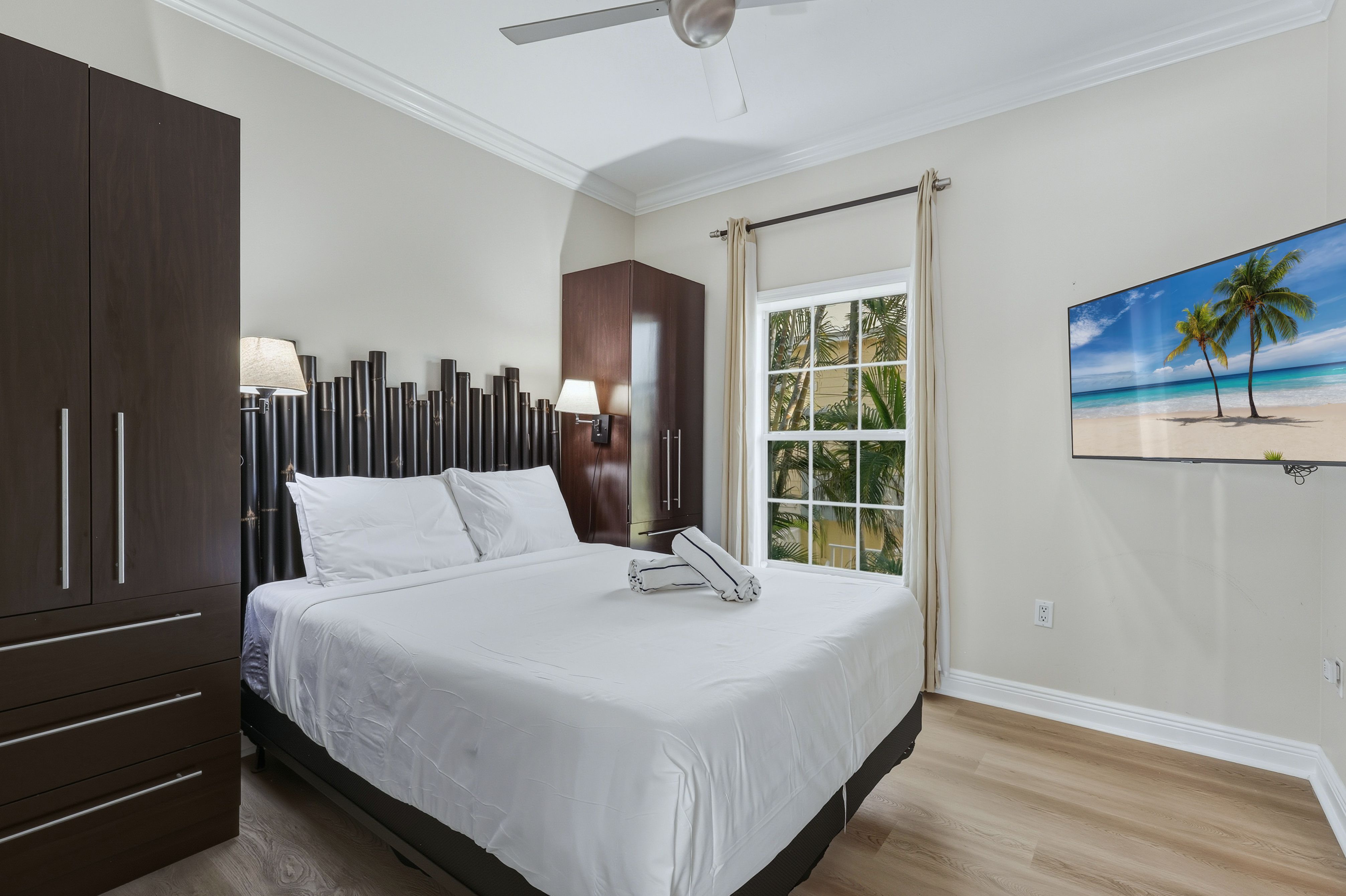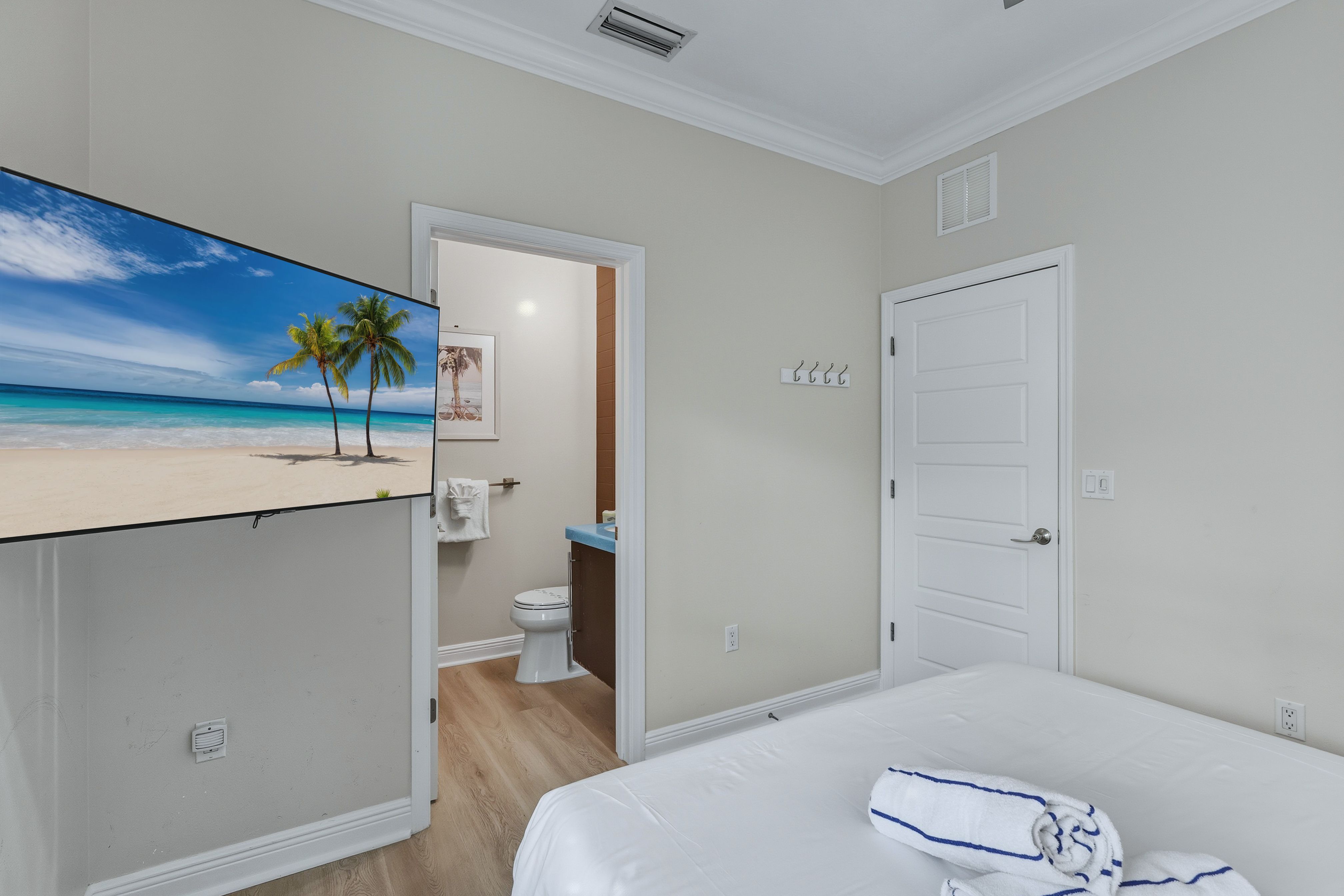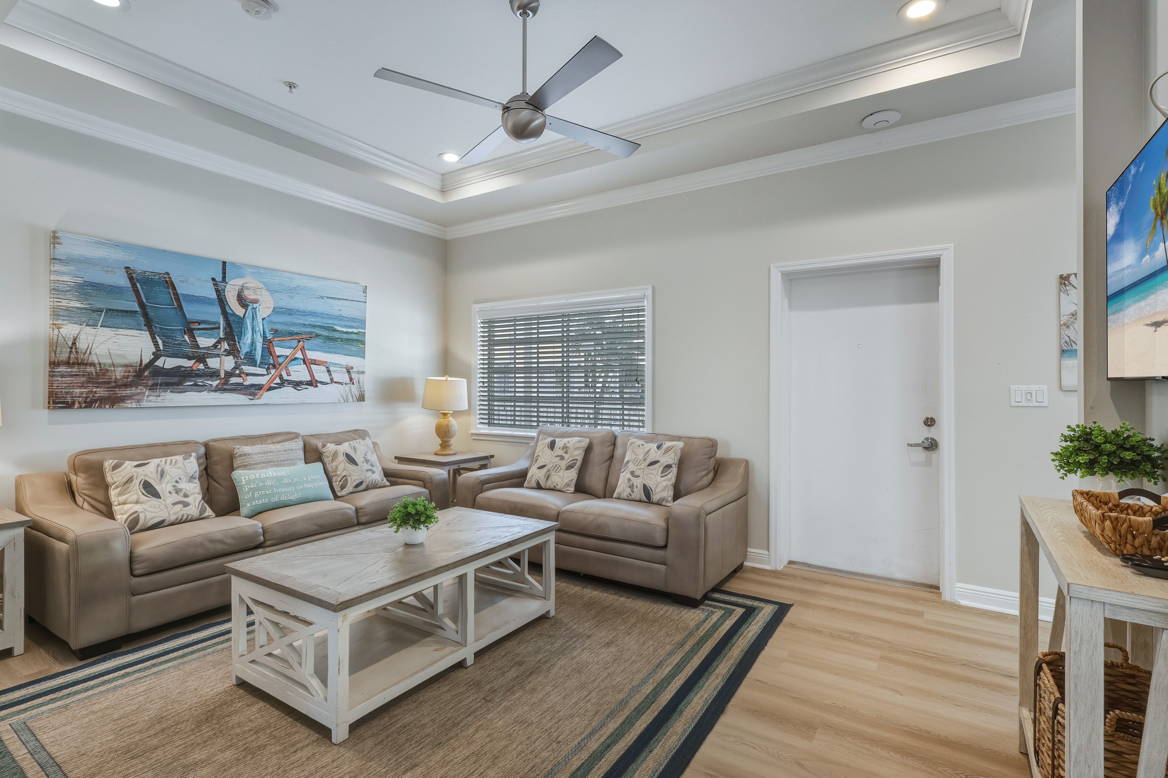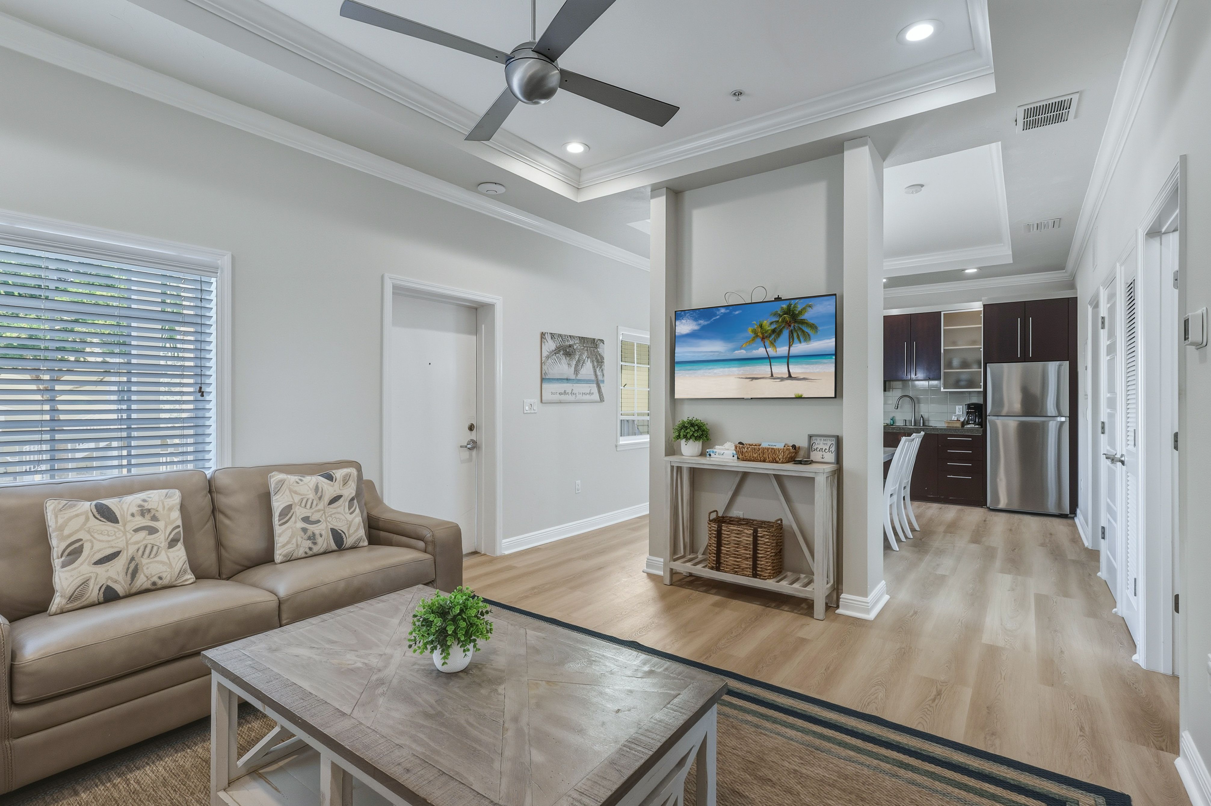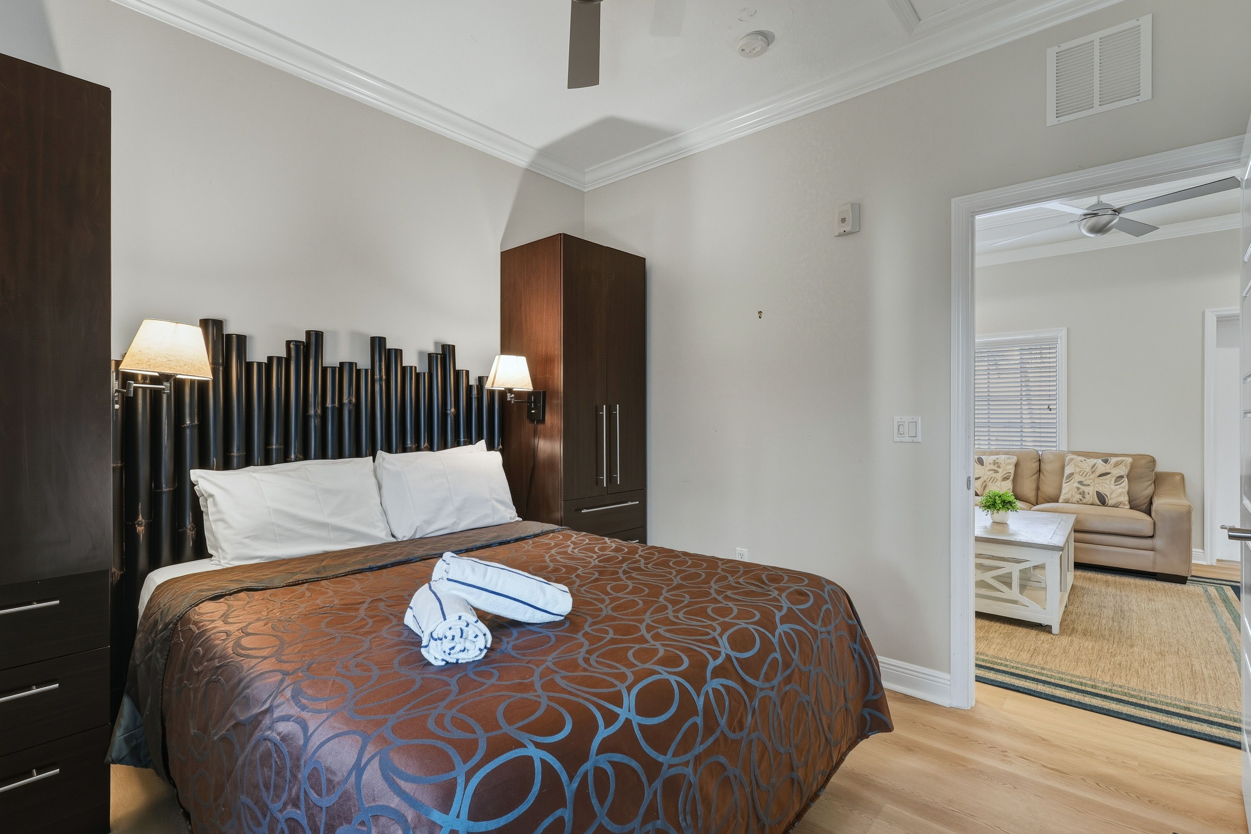 Unit #104D Features: 2-bedroom, 2-bathroom deluxe unit in building D which faces the community pool. Deluxe units have a larger living space divided by a separation wall with flat screen TV's on both sides.