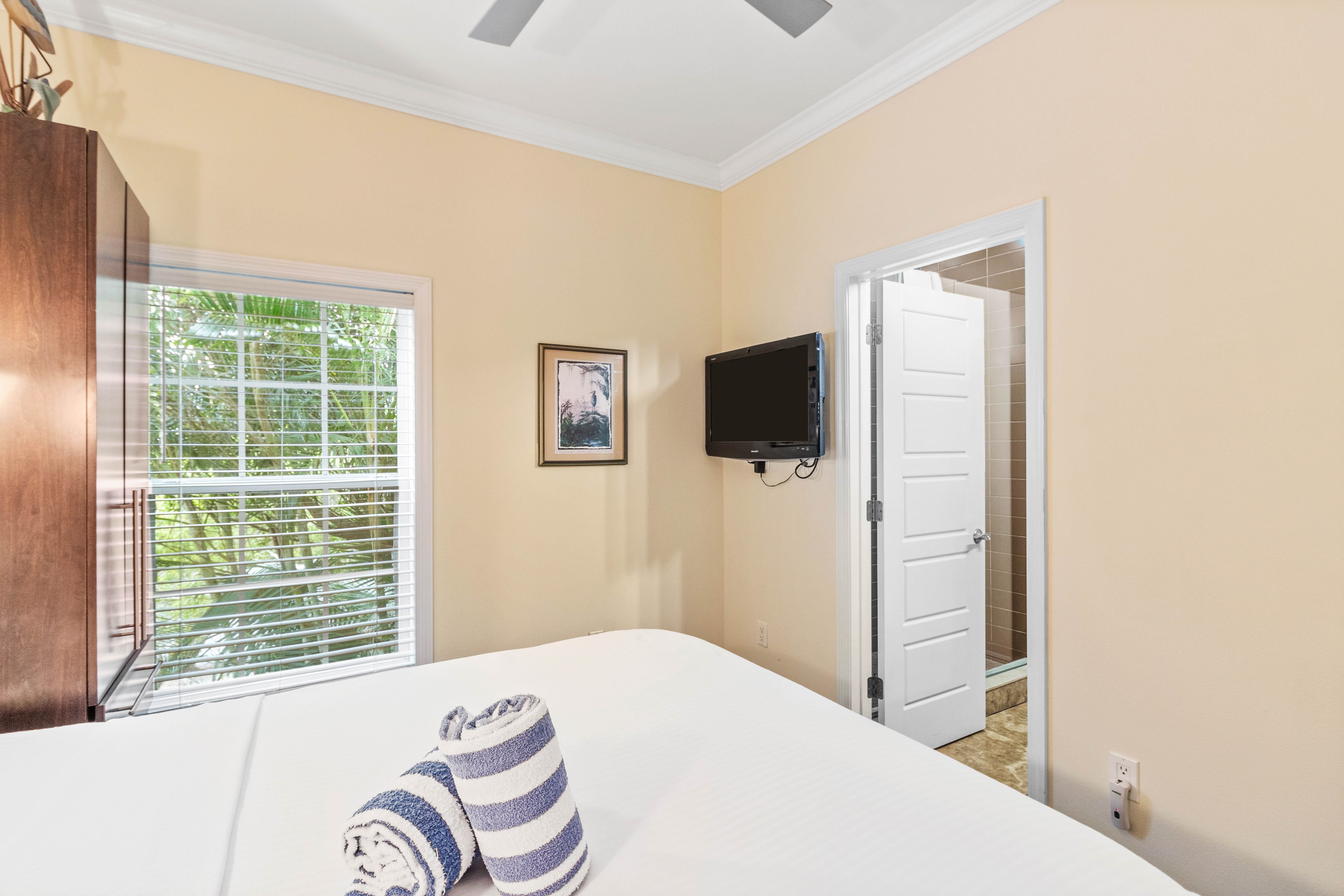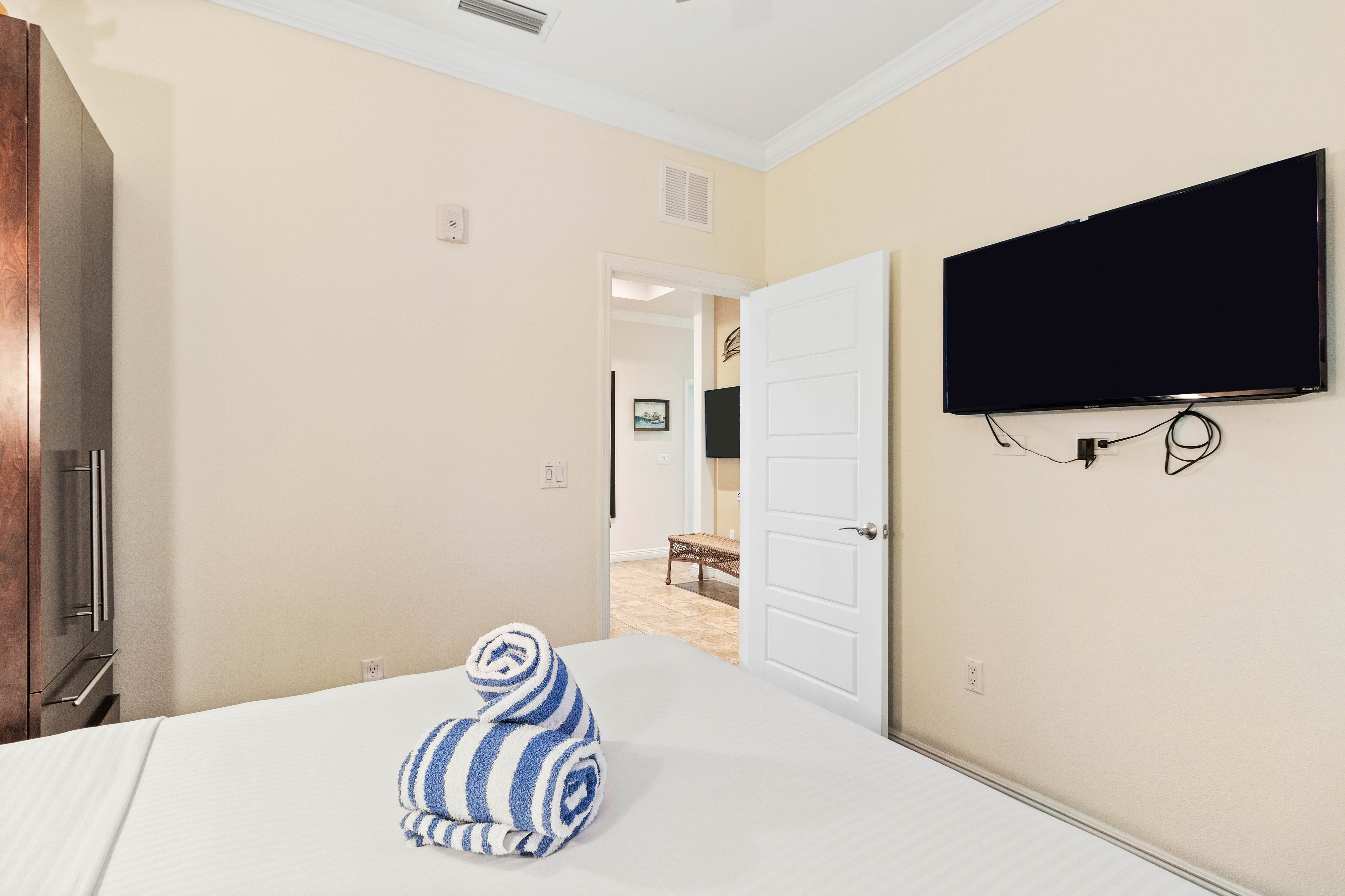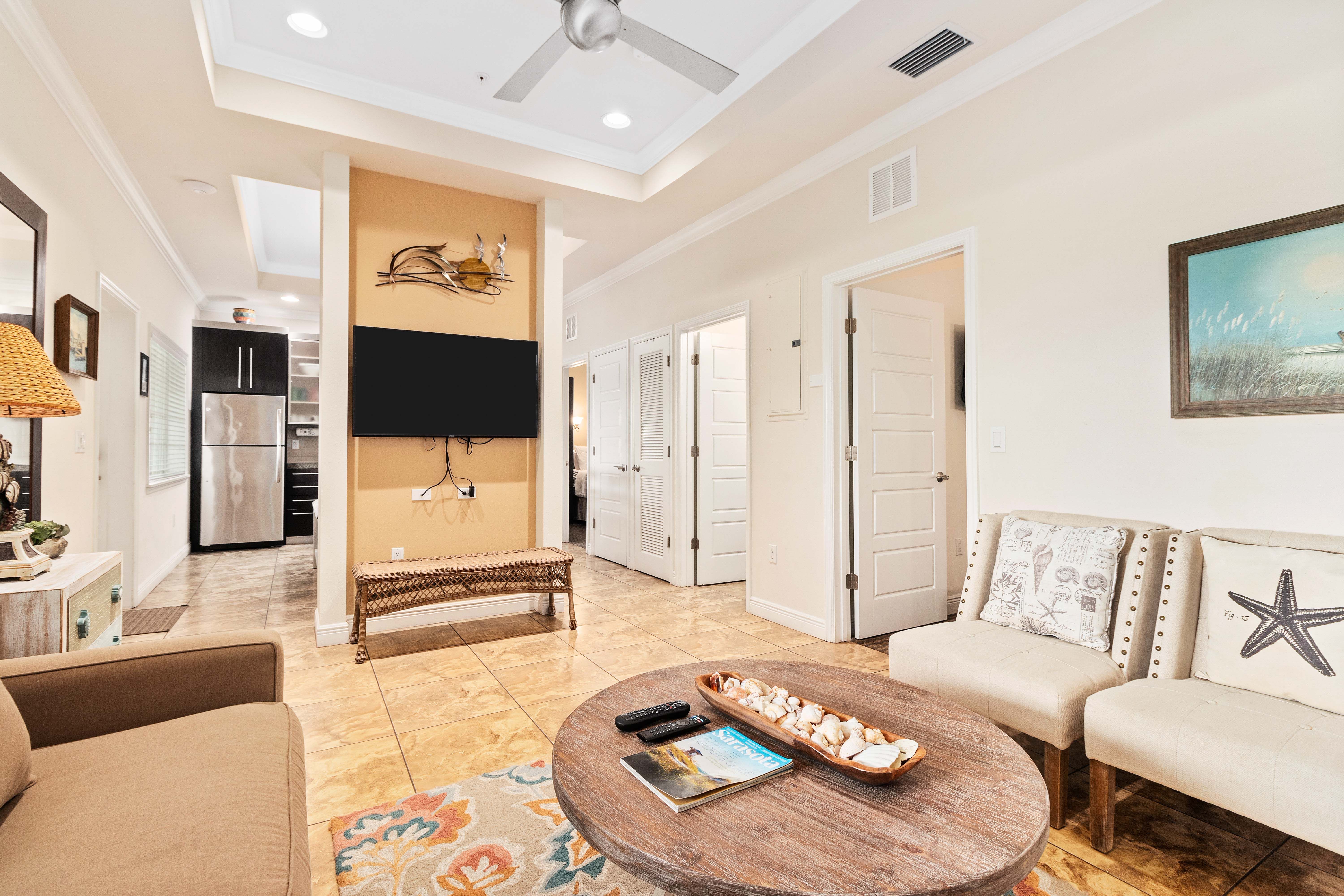Unit #204C Features: 2-bedroom, 2-bathroom deluxe unit including a sofa sleeper in building C with a shared patio area. Deluxe units have a larger living space divided by a separation wall with flat screen TVs on both sides.
