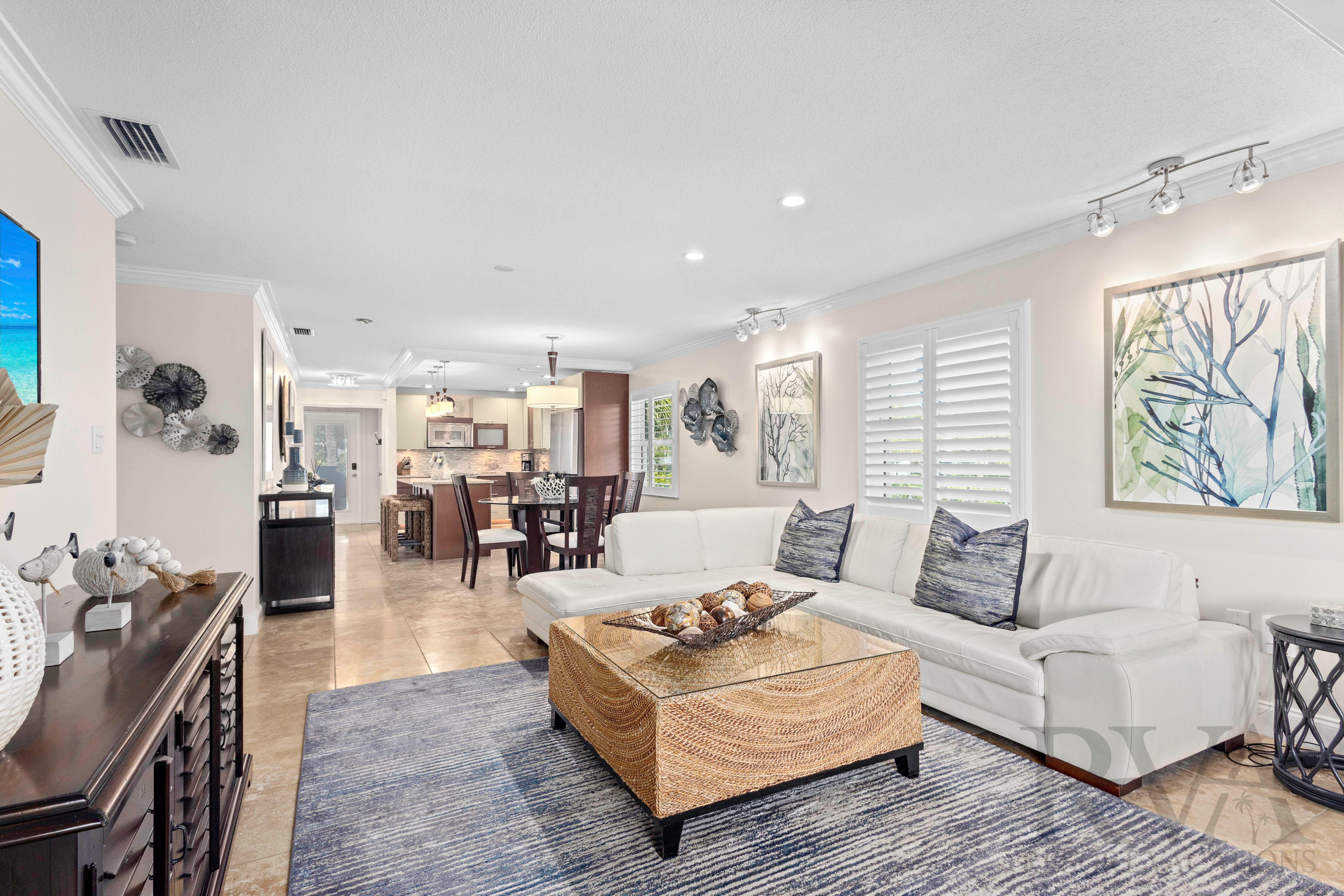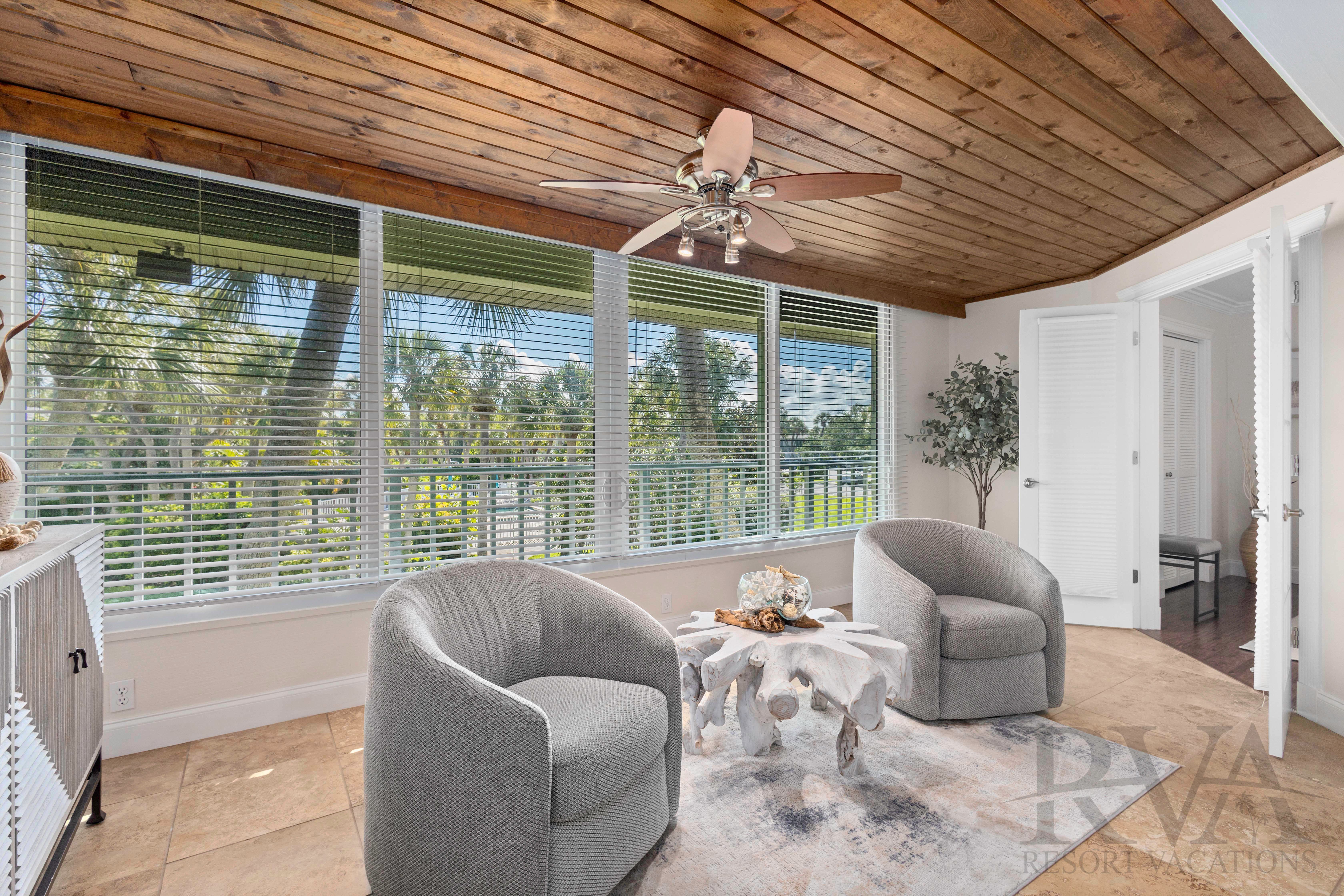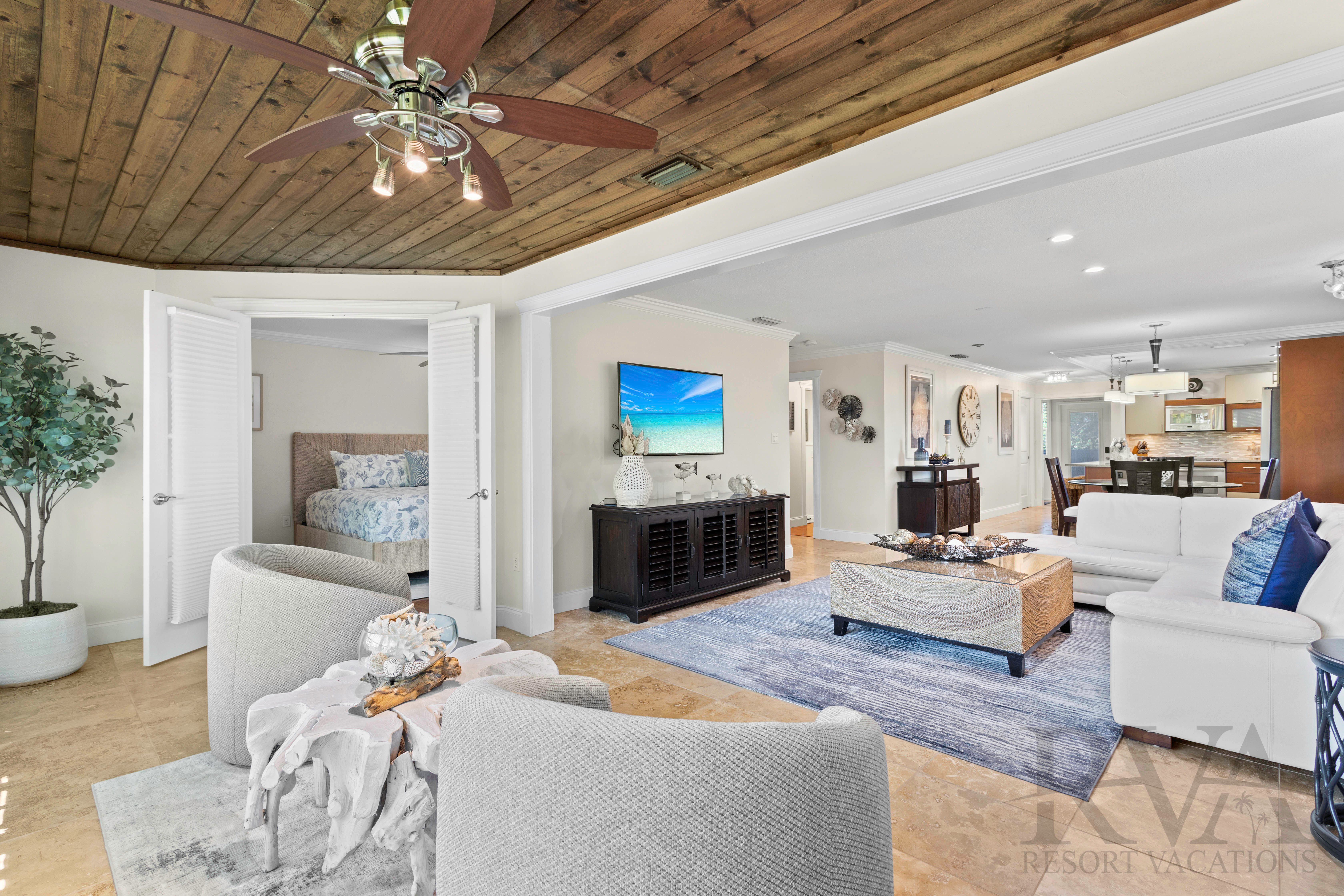 Relax in the inviting living room, where a separate sunroom with wood ceilings offers lush, manicured grounds and serene views of the pool.